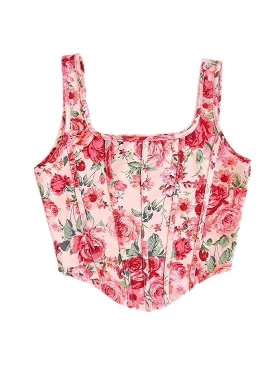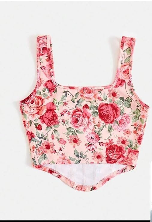 - DESIGN: Stylish corset-style crop top featuring a beautiful blue rose and floral print pattern on a light background