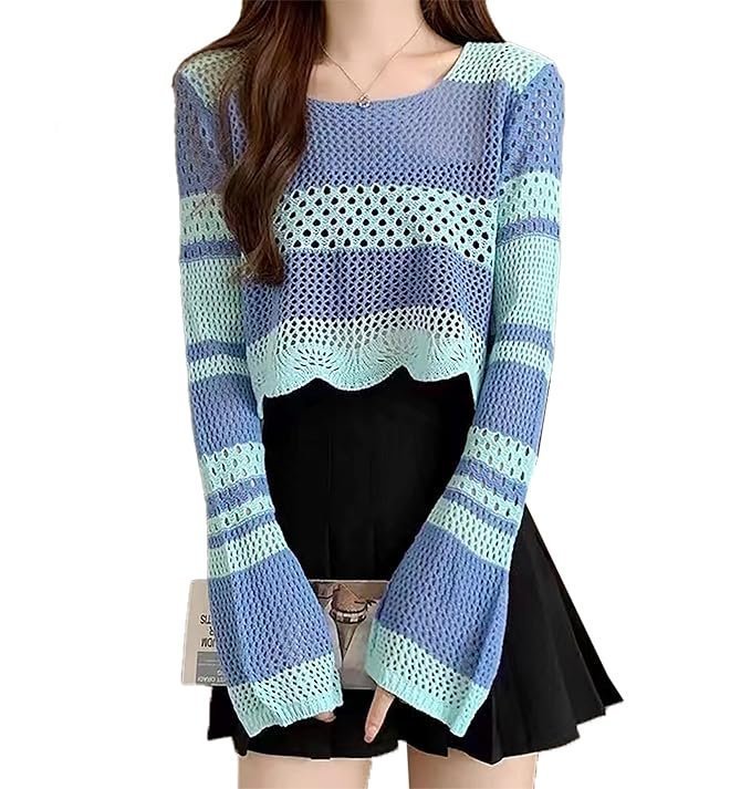 ICW Women’s Korean Style Knitted Sheer Crochet Long Sleeve Hollow Out Colour Block Print Crop Top T-Shirt Sweater (One Size Fit XS-S-M Bust 32-36 Inch) 29