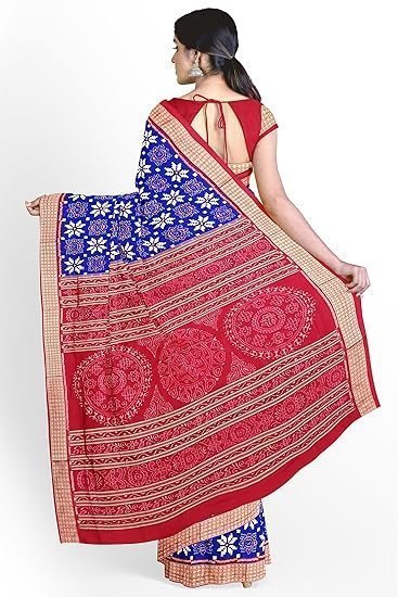 OdiKala Sambalpuri Silk Saree with Blouse Piece, Blue Base with Flower Design, Red Pallu and Border